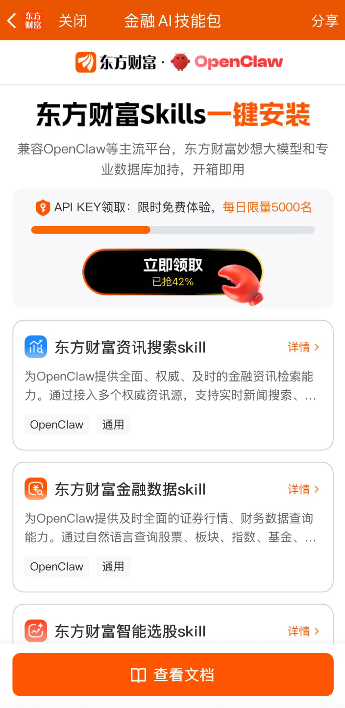 在这场“龙虾”引发的变局中,东方财富显然是动作最快、姿态最开放的券商之一。他们选择以“Skills技能包”切入OpenClaw生态,用户还可免费领取APIKey。这不仅是一款兼容OpenClaw协议的工具,更是一次基于核心数据优势的生态重构。